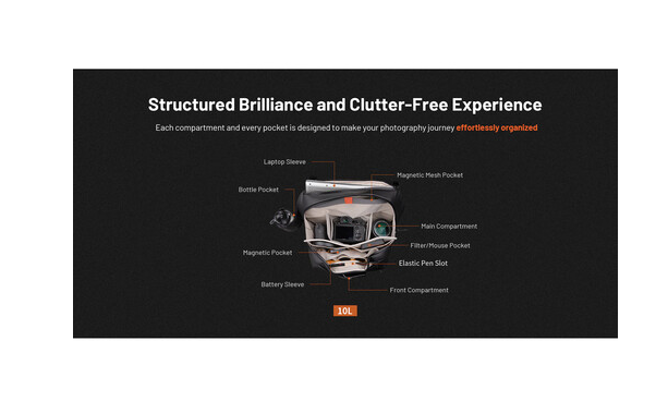 Vnútri sú nastaviteľné polstrované priehradky, vnútorné vrecko na batériu a magnetické vrecká, v ktorých môžete prehľadne usporiadať príslušenstvo, ako sú batérie, filtre, káble, powerbanky a pevné disky. Široko otvorený dizajn umožňuje rýchly prístup k vašej výbave, zatiaľ čo predné vrecko s rýchlym prístupom je ideálne na nevyhnutné veci, ako je telefón, karty a kľúče.