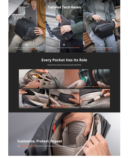 Taška PGYTECH OneGo Solo Sling Bag V2 (P-CB-155) je premyslene navrhnutá taška na každodenné nosenie fotoaparátu, určená pre fotografov, filmárov a tvorcov, ktorí sú často na cestách. S objemom 10 litrov pohodlne pojme fotoaparát a až tri objektívy v hlavnom priestore, zatiaľ čo špeciálne zadné vrecko bezpečne pojme 14-palcový MacBook alebo 12,9-palcový iPad Pro.