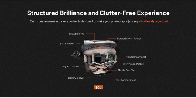 Taška PGYTECH P-CB-153 OneGo Solo Sling Bag V2 kombinuje moderný štýl s praktickou funkčnosťou pre fotografov, ktorí sú často na cestách. Táto taška s objemom 10 litrov v obsidiánovo čiernom vyhotovení pohodlne pojme fotoaparát a až tri objektívy vo svojej polstrovanom hlavnom priestore, ktorý je organizovaný pomocou troch nastaviteľných vnútorných priehradiek a jednodielnej tvarovanej priehradky pre efektívne usporiadanie.