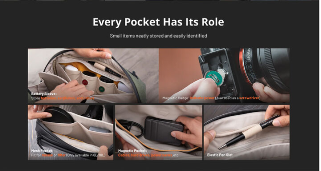 Do špeciálneho zadného priestoru sa bezpečne zmestí 14-palcový MacBook alebo 12,9-palcový iPad Pro, zatiaľ čo viacero vnútorných vreciek pojme batérie, káble, filtre, powerbanky, pevné disky a iné technické príslušenstvo. Predný priestor s rýchlym prístupom je ideálny na osobné veci, ako je telefón, kľúče alebo peňaženka.