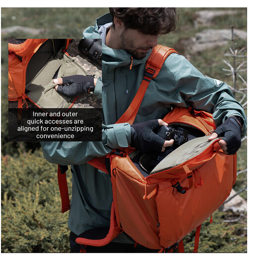 Batoh je vyrobený z materiálu Cordura s PU povrchovou úpravou, je odolný voči vode a opotrebeniu. 3D oblúkový rám z leteckého hliníka zaisťuje štruktúru a stabilitu, zatiaľ čo 3D kontúrované ramenné a bedrové popruhy spolu s ergonomickým zadným panelom z vzdušnej sieťoviny zaisťujú pohodlné nosenie po dlhú dobu. Rýchly bočný prístup a bočné vrecká na fľaše s vodou zvyšujú pohodlie počas fotografovania a 4-stupňová nastaviteľná dĺžka chrbta umožňuje prispôsobenie rôznym typom postavy.