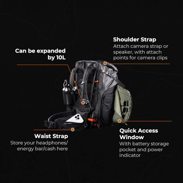 Batoh PGYTECH OnePro Flexs objemom 50 l vám umožní bezpečne uložiť fotografickú výbavu a mať ju vždy po ruke. Objem je možné rozšíriť o ďalších 10 l v hornej časti.