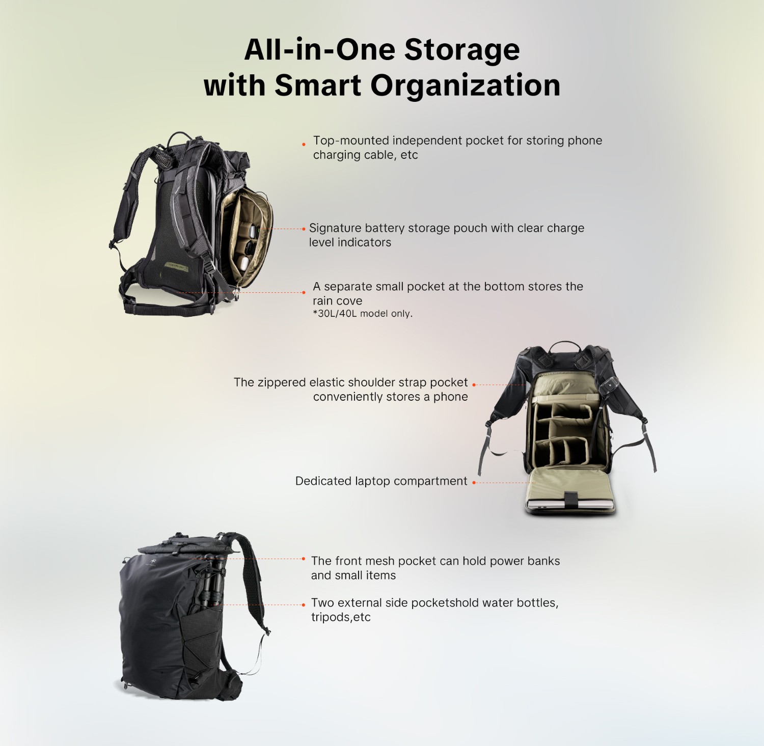 Batoh je vybavený štandardným vnútorným priestorom s dvojitým využitím (prepínateľným medzi konfiguráciami Medium a Small). Keď nie je potrebný, dá sa zložiť, čím sa hlavný batoh okamžite premení na univerzálny outdoorový batoh.