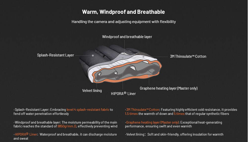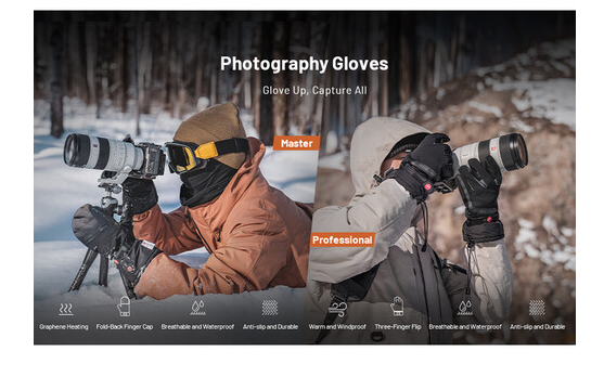 Rukavice kombinujú bavlnu 3M Thinsulate, nepremokavú a priedušnú podšívku HIPORA, vetruodolnú vrstvu a látku odolnú proti striekajúcej vode, aby chránili vaše ruky pred chladom, vetrom a vlhkosťou. Polstrované kožené dlane a SBR výstelka zlepšujú priľnavosť a pohodlie, zatiaľ čo zamatová podšívka dodáva mäkkosť a izoláciu. Ohrnuté prstové čiapky umožňujú ľahký prístup pre presné ovládanie fotoaparátu a proti stratovité zápästné remienky a pracky udržujú rukavice na mieste a pohromade. Tieto rukavice sú ideálne pre extrémne teploty od -31 do 32 °F (-35 až 0 °C) a sú dokonalým spoločníkom pre fotografovanie vonku v zime.