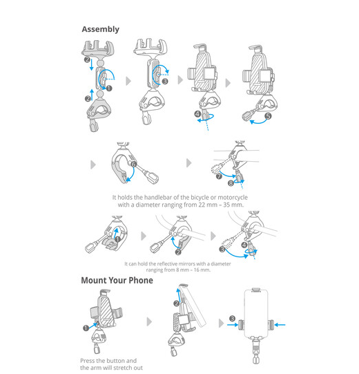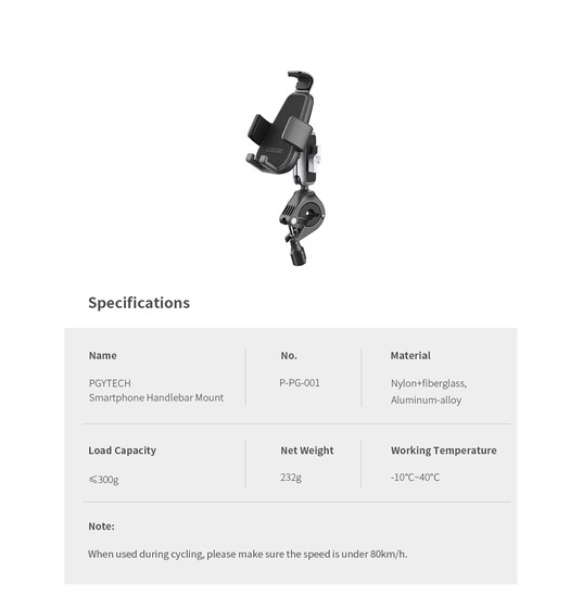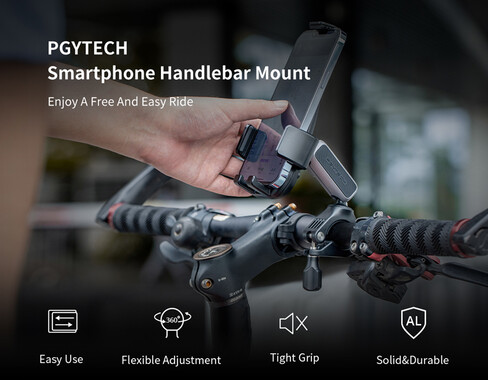 S držiakom PGYTECH P-PG-001 na riadidlá budete mať svoj smartfón počas jazdy vždy po ruke a v bezpečí. Tento držiak je určený pre bicykle, motocykle a ramená bočných zrkadiel a upína sa na riadidlá s priemerom od 0,3" do 1,4", čím je zabezpečená kompatibilita s väčšinou štandardných riadidiel. Jeho úplne obopínajúci držiak poskytuje kompletnú ochranu vášho telefónu, s protišmykovou gumou na zadnej strane, ramenách a hornej časti, aby sa zabránilo skĺznutiu alebo vibráciám.