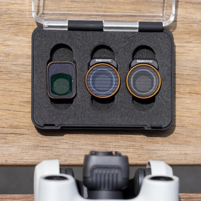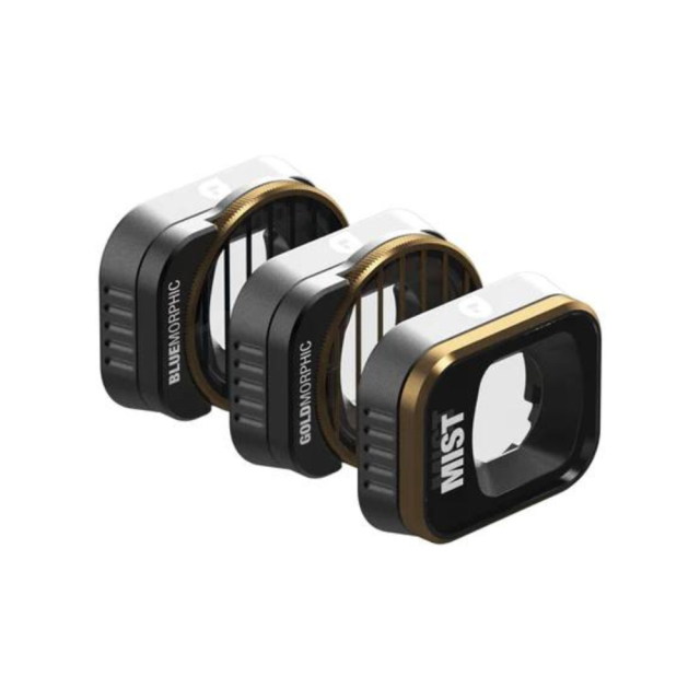 Súbor predfiltračných efektov pre dron DJI Mini 3 Pro vrátane filtrov BlueMorphic, GoldMorphic a Mist [1/4] na kreatívnu prácu s odleskami a textúrou obrazu. Rovnako ako ostatné filtre PolarPro určené pre dron DJI Mini 3 Pro majú pevnú konštrukciu s hliníkovým rámom a odolné sklo CinemaSeries vyrobené v Nemecku na ochranu objektívu.