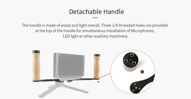 HD-1 je profesionálny ručný držiak určený pre 7-palcové (a kompatibilný s 9-palcovými) režisérske monitory, vyrobený z pevnej hliníkovej zliatiny s ergonomickými drevenými rukoväťami pre bezpečné a pohodlné uchopenie pri dlhodobom používaní. Obsahuje viac ako 17 strategicky umiestnených 1/4" otvorov na skrutky, ktoré umožňujú súčasné pripevnenie monitorov, statívov, bezdrôtových video vysielačov, batérií v tvare V a výstužných dosiek. S kompaktnou dĺžkou 360 mm a nízkou hmotnosťou iba 300 g zaručuje HD-1 ľahkú prenosnosť bez obetovania stability alebo funkčnosti na pľaci.