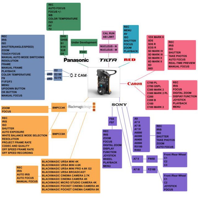 pre modely 1Dx Mark II, 5Ds, 5Ds R, EOS R, 5D Mark IV, 5D Mark III, 5D Mark II, 6D Mark II, 6D a 80D podporuje nahrávanie/fotografovanie, clonu, ISO, uzávierku, AF, náhľad v reálnom čase a MF.Pre fotoaparáty C700 PL, C700 GSPL, C300 Mark 2, C300 Mark 2 PL, C200, C200 B, C100 a C100 Mark 2 to zahŕňa funkcie záznamu uzávierky, clony, zaostrovania, digitálneho zoomu, displeja/joysticku a prehrávania.