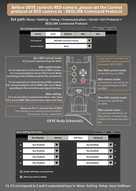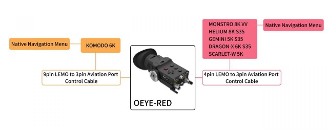 Hľadáčik OLED kamery PortKeys OEYE-RED ponúka natívne ovládanie/navigáciu v menu kamier RED Digital Cinema (MONSTRO 8K VV, HELIUM 8K S35, GEMINI 5K S35, DRAGON-X 6K S35) a je vybavený vstupmi/výstupmi 3G-SDI (až 1080p60) a súčasne vstupmi/výstupmi 4K HDMI (až 24 snímok za sekundu v DCI 4K alebo 30 snímok za sekundu v UHD). Je vybavený kvalitným 0,71" displejom OLED (200 cd/m2, 100 000:1), váži približne 400 g a spotrebuje ~10 W. Samozrejmosťou je dioptrická korekcia (+8D - -3D) a bohaté softvérové funkcie vrátane 3D korekcie LUT, merania signálu, zobrazenia falošných farieb, asistenta zaostrovania, zväčšenia obrazu atď.