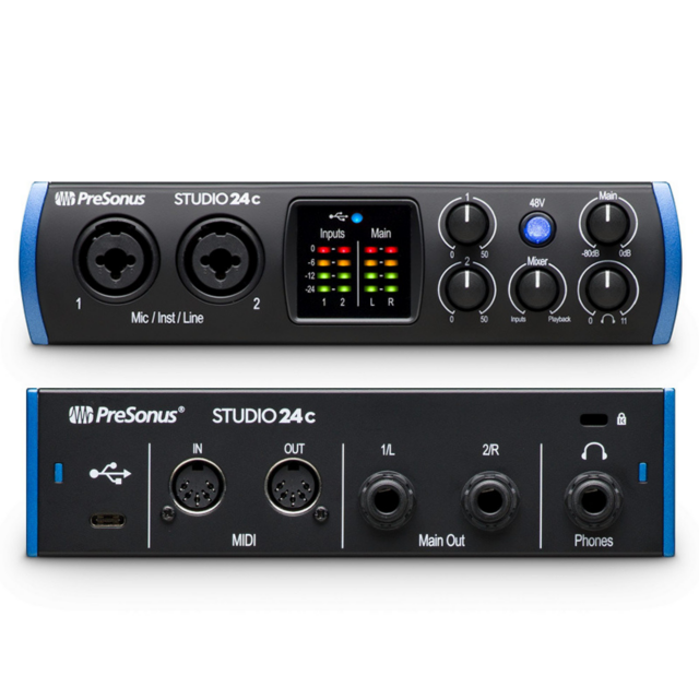 Či už nahrávate svoj prvý album, alebo najnovšiu epizódu svojho podcastu, Studio 24c vám pomôže znieť čo najlepšie. Vďaka dvom bezchybným mikrofónovým predzosilňovačom XMAX-L od spoločnosti PreSonus® na nahrávanie vokálov, nástrojovým predzosilňovačom s vysokým priestorom, takže môžete pripojiť gitaru alebo basgitaru priamo k rozhraniu, a profesionálnemu meraniu vstupov, aby ste mali prehľad o úrovniach nahrávania, poskytuje Studio 24c úžasnú kvalitu zvuku v robustnom, kompaktnom vyhotovení. Zvukové rozhranie Studio 24c, ktoré je kompletným domácim nahrávacím štúdiom ihneď po vybalení z krabice, sa dodáva s bezplatnou licenciou na oceňovaný softvér na produkciu hudby Studio One® Artist od spoločnosti PreSonus, takže môžete hneď začať nahrávať.