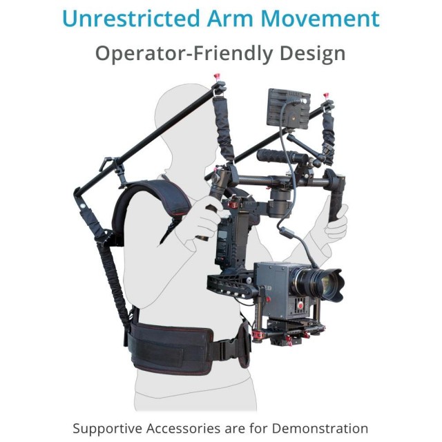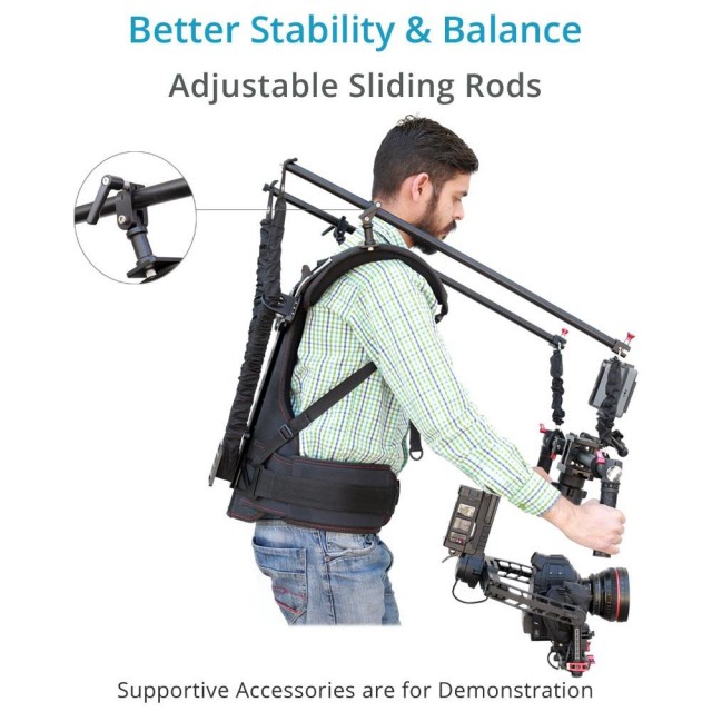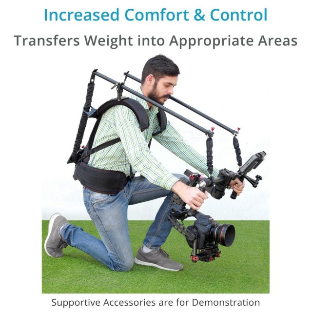 Ľahká a polstrovaná vesta vyrobená z priedušnej tkaniny, ktorá neprodukuje pot, je vybavená nylonovou elastickou šnúrou Bungee absorbujúcou nárazy, ktorá eliminuje stres a poskytuje oporu pri dlhých hodinách snímania. Vesta sa ľahko prispôsobí všetkým typom postavy. Je vybavená nastavením v 3 oblastiach - výška/ramená, napnutie a pás. Napätie gumy a dĺžku ramien môžete ľahko nastaviť zmenou polohy červených gombíkov na doske v závislosti od telesnej stavby & hmotnosti nastavenia. Pás si môžete nastaviť od 28" do 46" podľa toho, ako vám sedí, a to vlastným nastavením popruhov so suchým zipsom. Push-fit pracky uľahčujú a spríjemňujú nosenie. Horný systém umožňuje voľný pohyb ramien. Výsledný pocit je väčšia ľahkosť a kontrola.