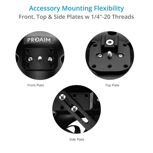 Má tiež predné, horné a bočné montážne dosky s viacerými závitmi 1/4”-20, ktoré podporujú rôzne možnosti upevnenia kamery, externého napájania a ďalšieho príslušenstva, ako je malé video svetlo alebo mikrofón.