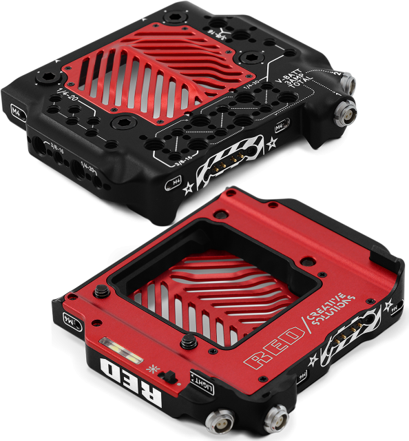 Adaptéry na batérie V-Lock a Gold Mount obsahujú P-tap/D-tap a bezpečnostný systém E-Fuse a systém pogo pripojenia na prepojenie s vrchnou doskou. Tieto adaptéry umožňujú fotoaparátu prijímať batérie V-Lock a Gold Mount plnej veľkosti.