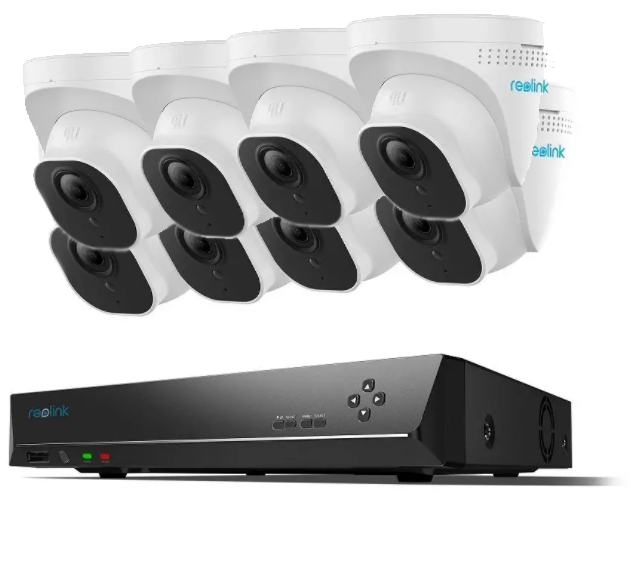 Sada 16 kanálového 4K PoE NVR rekordéra Reolink RLN16-410 a 8ks 4K IP PoE kamier Reolink D800 pre vnútorné aj vonkajšie použitie (certifikácia IP66). K systému je možné pridať/dokúpiť ešte 4 kamery.