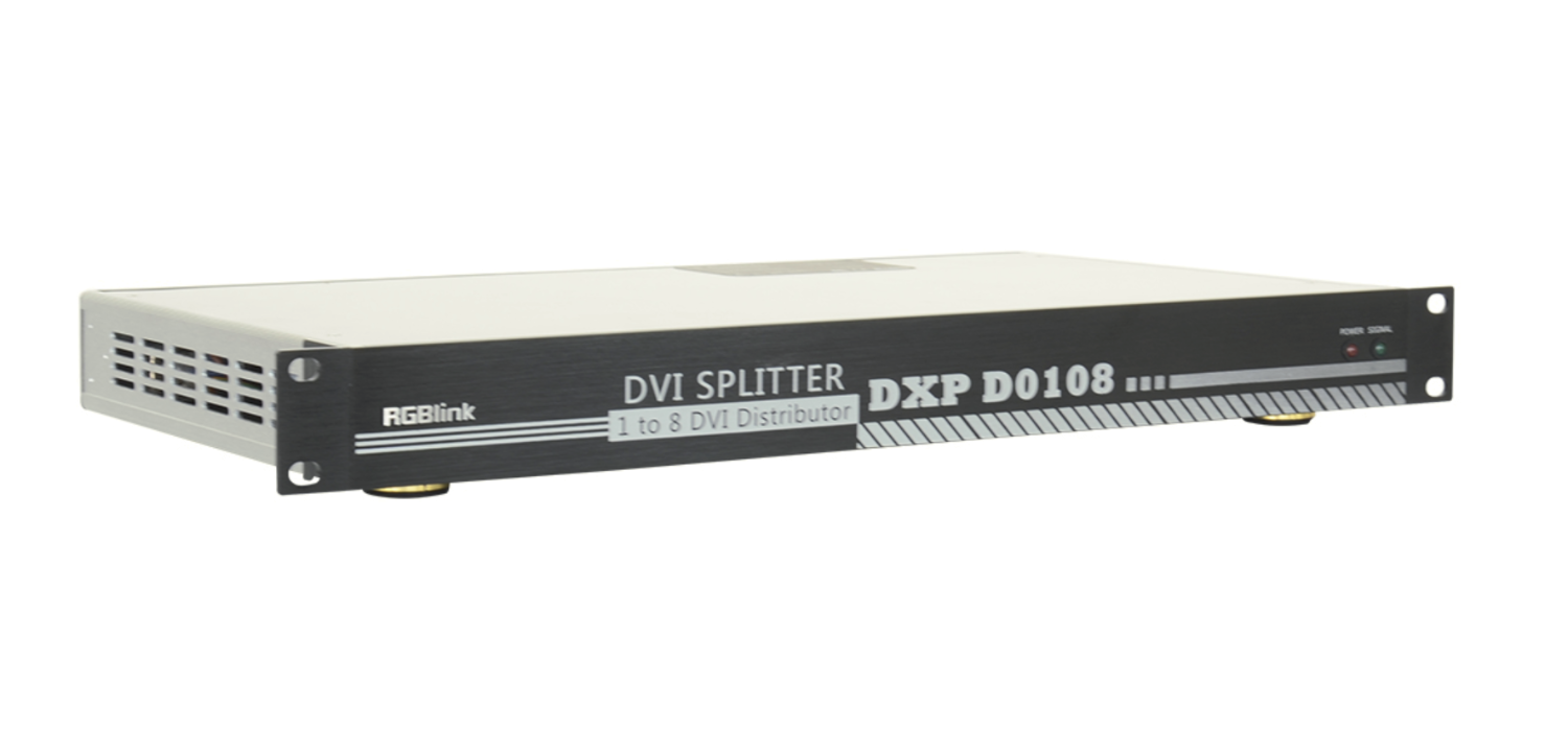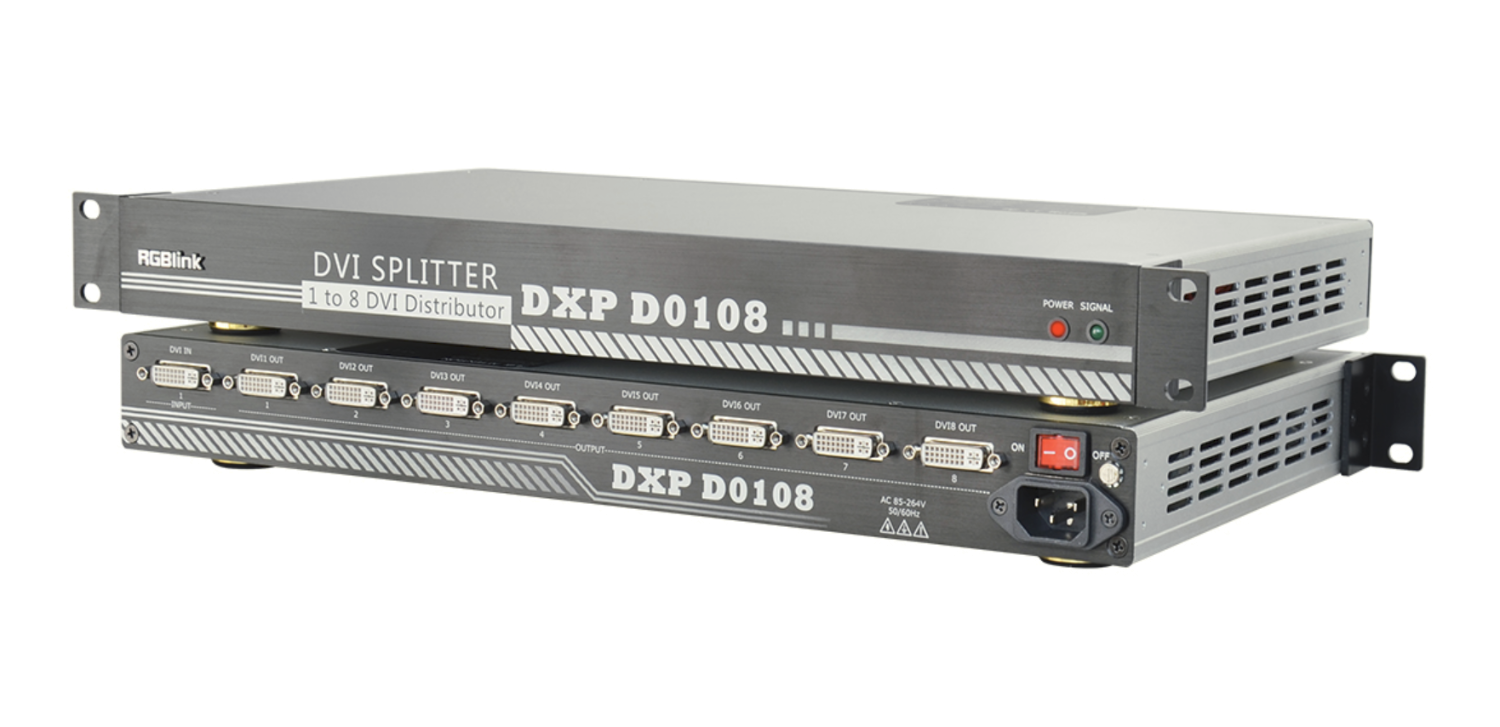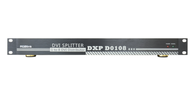 RGBlink DXP D0108 je 1-v-8 zosilňovač distribúcie videa určený pre profesionálne AV zariadenia, učebne, riadiace miestnosti a vysielacie prostredia. Táto kompaktná jednotka 1RU prijíma jeden vstup DVI (kompatibilný s HDMI) a distribuuje ho do ôsmich výstupov DVI, pričom automaticky rozpoznáva formáty vstupu pre plynulú prevádzku.