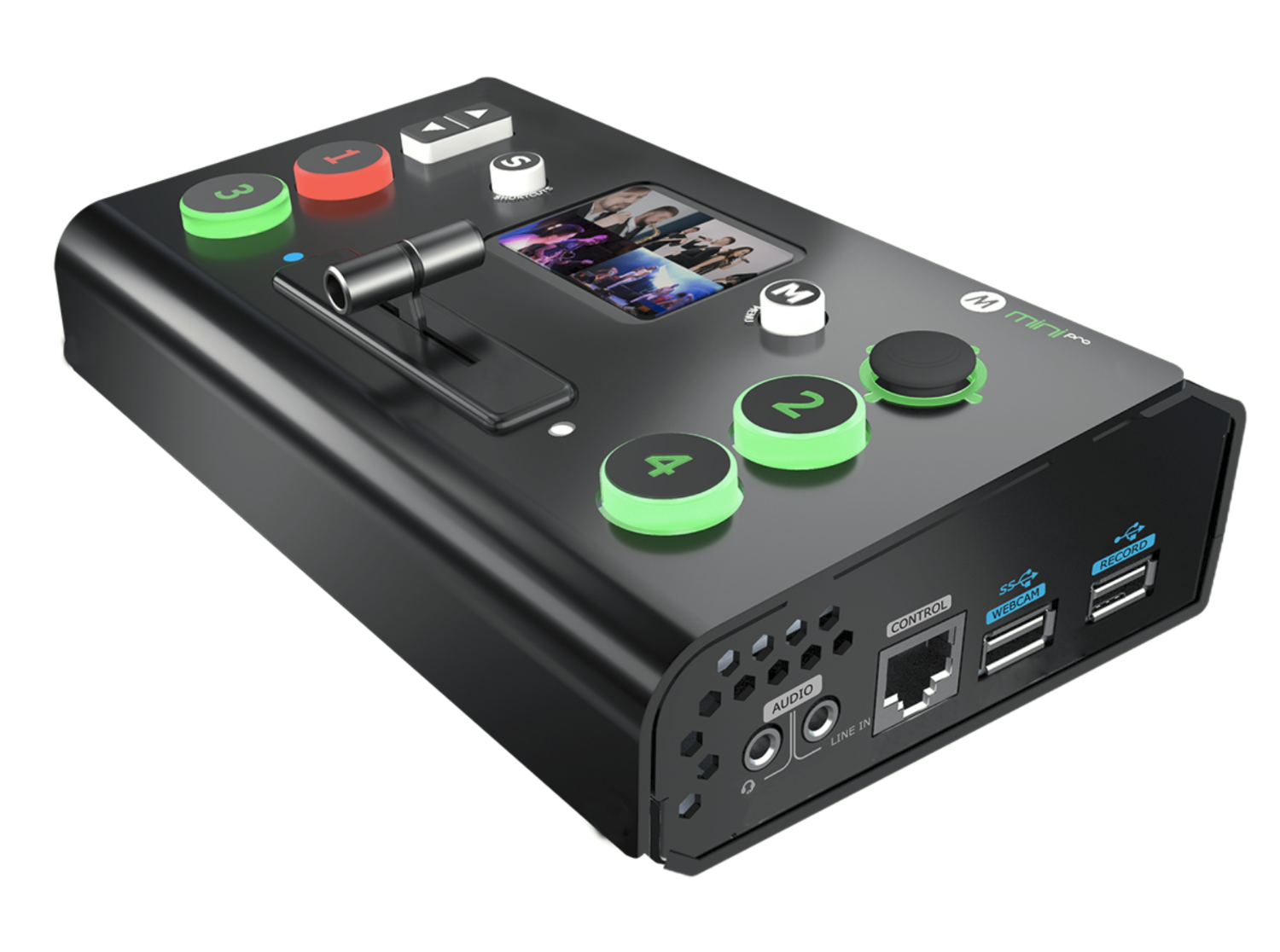 Mini-pro 2022 je vybavený klasickým prepínačom T-bar, joystickom na ovládanie kamery s podporou VISCA PTZ a 14 prechodovými efektmi, vďaka čomu je živé prepínanie plynulé a intuitívne. Podporuje živé vysielanie cez USB 3.0, kde je zariadenie rozpoznávané ako webová kamera populárnymi platformami, a nahrávanie cez USB 2.0 priamo do úložiska FAT32 alebo exFAT (až 2 TB). Pokročilé spracovanie zvuku umožňuje mixovanie vstavaného zvuku HDMI s externými zvukovými vstupmi, pričom sa zachová synchronizácia zvuku a videa s nastaviteľným oneskorením.