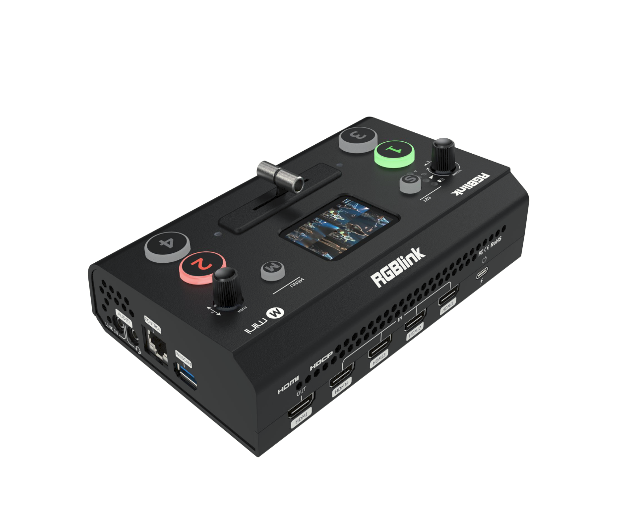 Mini 2022 live production switcher RGBlink kombinuje prepínanie, monitorovanie, mixovanie zvuku a streamovanie do jedného kompaktného zariadenia. Je vybavený štyrmi vstupmi HDMI 1.3 a jedným výstupom HDMI a podporuje multiview s 6 obrazmi, čo umožňuje operátorom rýchlo prepínať medzi náhľadom a programovými výstupmi pre spoľahlivé živé prepínanie. Integrovaná 2,1-palcová farebná obrazovka TFT poskytuje monitorovanie signálu v reálnom čase a intuitívnu navigáciu v ponuke.