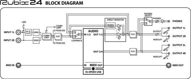 SENS 1L/2R, Hi-Z, 48V, THRS, COMP/LIMIT, DIRECT MONITOR, MONO, OUTPUT, PHONES, POWER SOURCE, LOOPBACK, COMP/LIMIT TYPE, GROUND LIFT, PHONES SOURCE