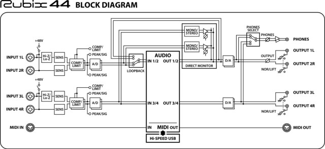 Vysoko dynamické zdroje, ako sú bicie nástroje, často potrebujú skrotenie úrovne pomocou spracovania dynamiky. Bežne sa tiež používa kompresia na vokály a basy počas sledovania, aby sa vyrovnali úrovne a tieto zdroje sa ľahšie mixovali. Rubix44 je vybavený kompresormi/limitérmi prístupnými z panela na vstupoch 1/2 a 3/4, ktoré zabezpečujú dobré, horúce signály bez orezávania a nežiaduceho skreslenia. Spracovanie dynamiky je úplne analógové, čo poskytuje plynulé a transparentné ovládanie s nulovou pridanou latenciou.
