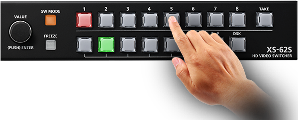 Video prepínač XS-62S dokáže bezproblémovo prepínať šesť vstupov vrátane 3G-SDI, HDMI a analógových (RGB, komponentných a kompozitných) zdrojov spolu s dvoma statickými snímkami uloženými vo vnútornej pamäti. Je možné zvoliť tri režimy prepínania videa, čo umožňuje široké spektrum aplikácií modelu XS-62S.