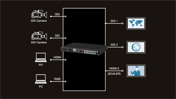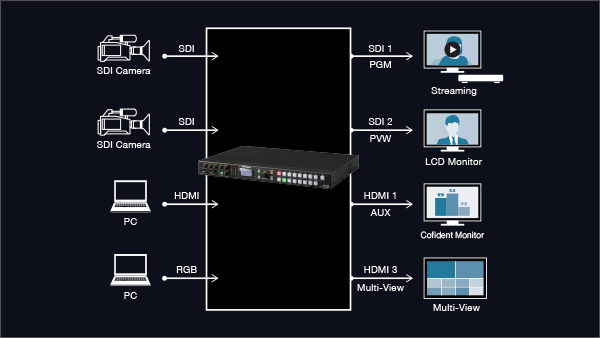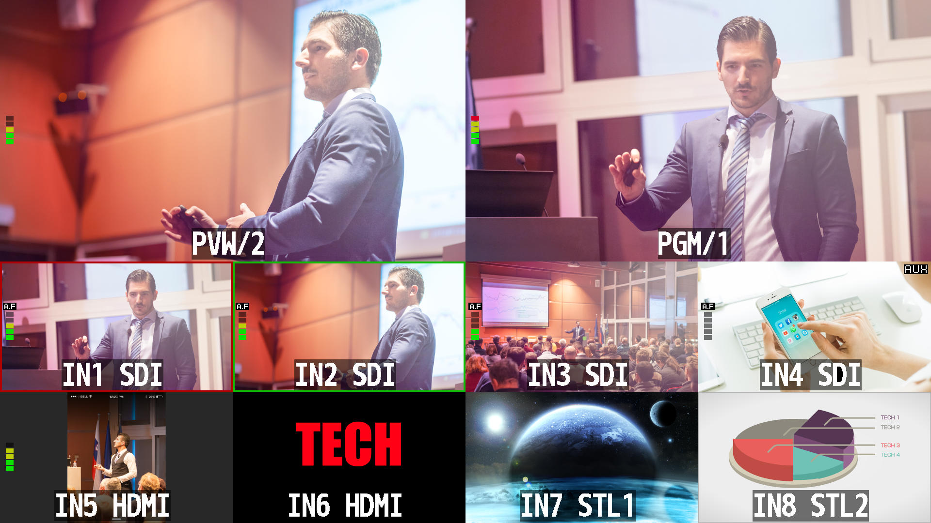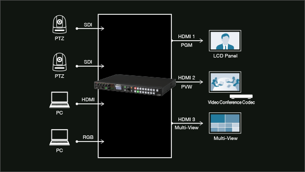Režim Matrix umožňuje jednoducho posielať rôzny obsah na dve alebo tri cieľové obrazovky z jedného prepínača, a to všetko pri miešaní zvuku programu a ovládaní vzdialených kamier PTZ.