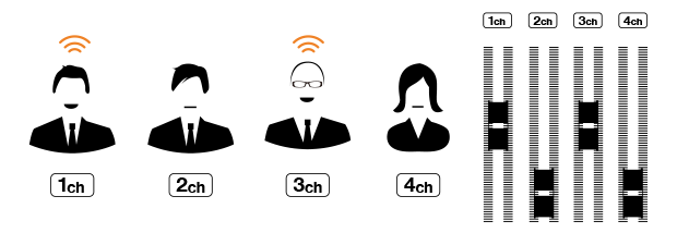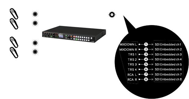 Vložte až osem analógových zvukových vstupov na samostatné kanály na výstupoch SDI 1 a 2. Vyberte si z rôznych kanálov - pred efektom (suchý), po efekte a pred faderom (mokrý) alebo po efekte a po fadere (mokrý) - aby ste splnili svoje potreby postprodukcie po živom podujatí. Táto funkcia je užitočná aj pri viacjazyčných podujatiach, pretože umožňuje nahrávať hlasový komentár alebo jazykový preklad na vlastný zvukový kanál.