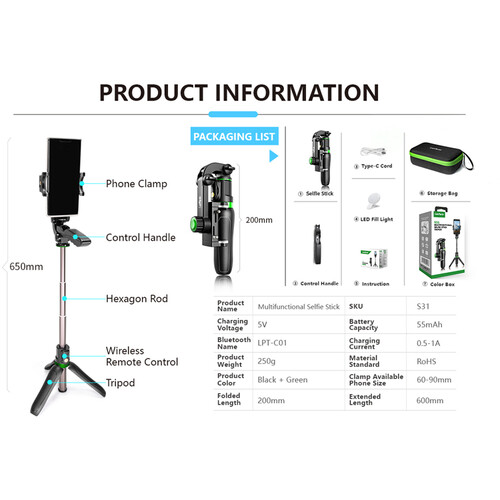 Táto kompaktná a ľahká multifunkčná selfie tyč S31 od spoločnosti LanParte funguje aj ako stabilizátor a statív pre váš smartphone.