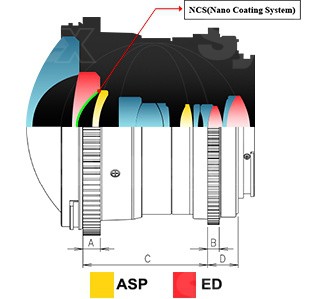 Asférické členy snižují barevnou aberaci k zajištění perfektní obrazové kvality a vysokého kontrastu ke středu a rohu snímku i v případě plně otevřené clony.