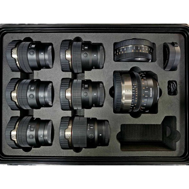 Súprava všetkých šiestich filmových objektívov Samyang série V-AF AF a príslušenstva v pevnom puzdre. Sada obsahuje objektívy V-AF 20 mm T/1,9 FE, V-AF 24 mm T/1,9 FE, V-AF 35 mm T/1,9 FE, V-AF 45 mm T/1,9 FE, V-AF 75 mm T/1,9 FE a V-AF 100 mm T/2,3 FE, ako aj anamorfný MF adaptér V-AF 1,7x a MF adaptér V-AF.