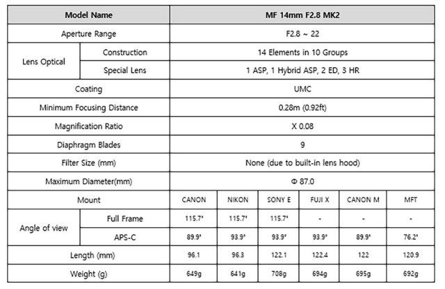 Objektív MF 14 mm F2,8 MK2 sa skladá zo 14 šošoviek v 10 skupinách vrátane troch šošoviek s vysokým indexom lomu (HR), jednej asférickej (ASP), jednej hybridnej asférickej (H-ASP) a dvoch ED šošoviek. Optická konštrukcia objektívu spolu s ochrannou vrstvou Ultra Multi Coating (UMC) na prednom prvku zabezpečuje ostrý obraz s minimálnymi farebnými chybami, minimálnu zaostrovaciu vzdialenosť 0,28 m a zorný uhol 115,7˚.