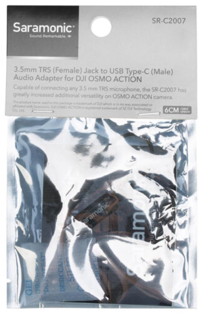Saramonic SR-C2007 je kompaktný 2,4-palcový (6 cm) audio adaptér optimalizovaný pre kamery DJI Osmo Action, s pozláteným 3,5 mm TRS konektorom na jednom konci a USB Type-C konektorom na druhom konci, ktorý umožňuje priame zachytávanie zvuku z externých mikrofónov, bezdrôtových prijímačov, rekordérov alebo mixérov. Poskytuje napájanie pre mikrofóny, ktoré nie sú napájané batériami, má odolné pozlátené kontakty pre čistú kvalitu signálu a váži len 6 g, čím ponúka tvorcom orientovaným na akciu odolné, nenápadné riešenie pre zlepšenie zvuku videa v extrémnych podmienkach.