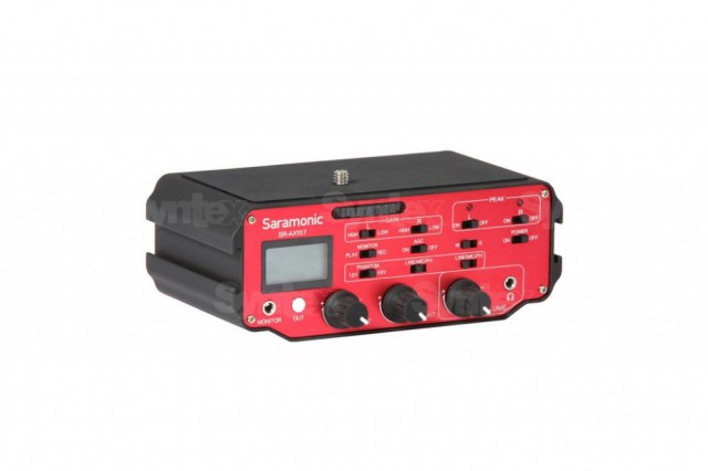 Nejvyšší model z řady audio rozhraní Saramonic SR-AX pro DSLR/DSLM přístroje a malé kamery je dvoukanálové mixážní zařízení s aktivní elektronikou vč. fantomového napájení. Nabízí dva symetrické XLR vstupy, přepínač zisku (0 / 20 dB) a útlumový článek 40 dB (MIC/LINE), přepínatelné 12V nebo 48V fantomové napájení, měření úrovní (-18 – +3 dB v krocích 3 dB), sluchátkový výstup s manuálním řízením hlasitosti, indikaci špičkové úrovně pro každý kanál, přepínač zdroje poslechu (vstup/výstup), funkci AGC ON/OFF pro vyřazení automatického řízení hlasitosti u kamer, které touto funkcí disponují (v nastavení OFF obsahuje levý kanál 20 kHz sinusový signál pro eliminaci AGC efektu v tichých pasážích), a také oddělovací transformátor. Upevňuje se ke spodní části kamer pomocí 3/8" stativového šroubu, stejný závit je i na spodní straně přístroje, oba boky hostí bleskové patice pro montáž dalšího příslušenství. Váha je 0,51 kg, rozměry 15,2x9,5x4,4 cm; napájení zajišťuje 9V baterie.