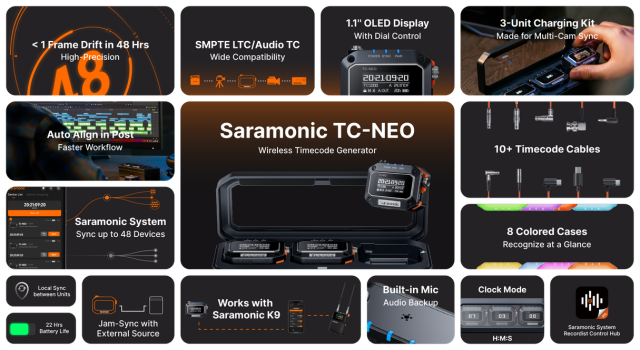 Saramonic TC-NEO je profesionálny bezdrôtový generátor časového kódu navrhnutý pre presnú a spoľahlivú synchronizáciu. Je vybavený vysoko presným TCXO s presnosťou ±0,5 ppm pre minimálny posun, viacerými metódami synchronizácie vrátane Bluetooth a 2,4 GHz a dlhou výdržou batérie 22 hodín pre celodenné natáčanie.