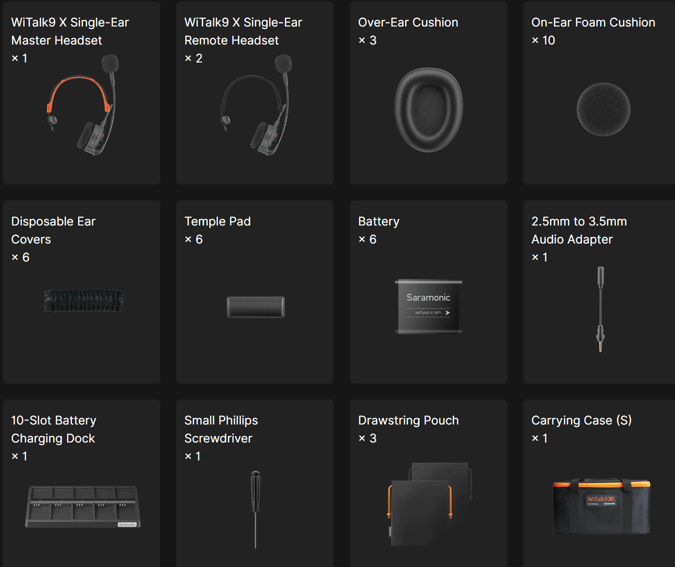 Bezdrôtový full-duplexný interkomový systém Saramonic WiTalk9 X pre 3 osoby s jedným slúchadlom (katalógové číslo WiTalk9 X-3S) je kompaktné komunikačné riešenie založené na technológii DECT bez potreby rozbočovača, ktoré pracuje v frekvenčnom pásme 1,9 GHz. Je určené pre profesionálne tímy, ktoré vyžadujú spoľahlivú hlasovú komunikáciu bez použitia rúk v náročných prostrediach, ako sú živé podujatia, filmová produkcia a terénne operácie.[1][9][10]