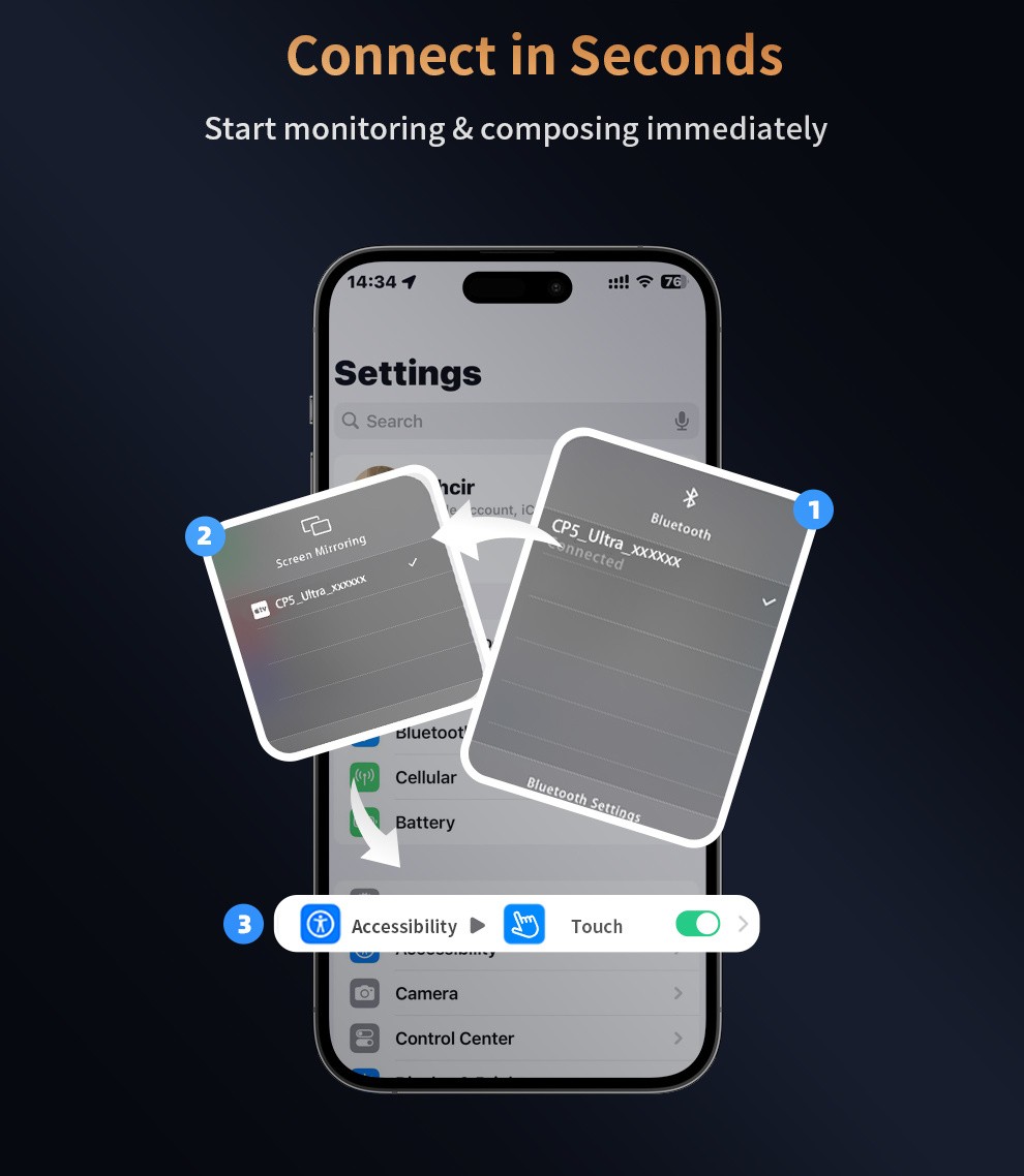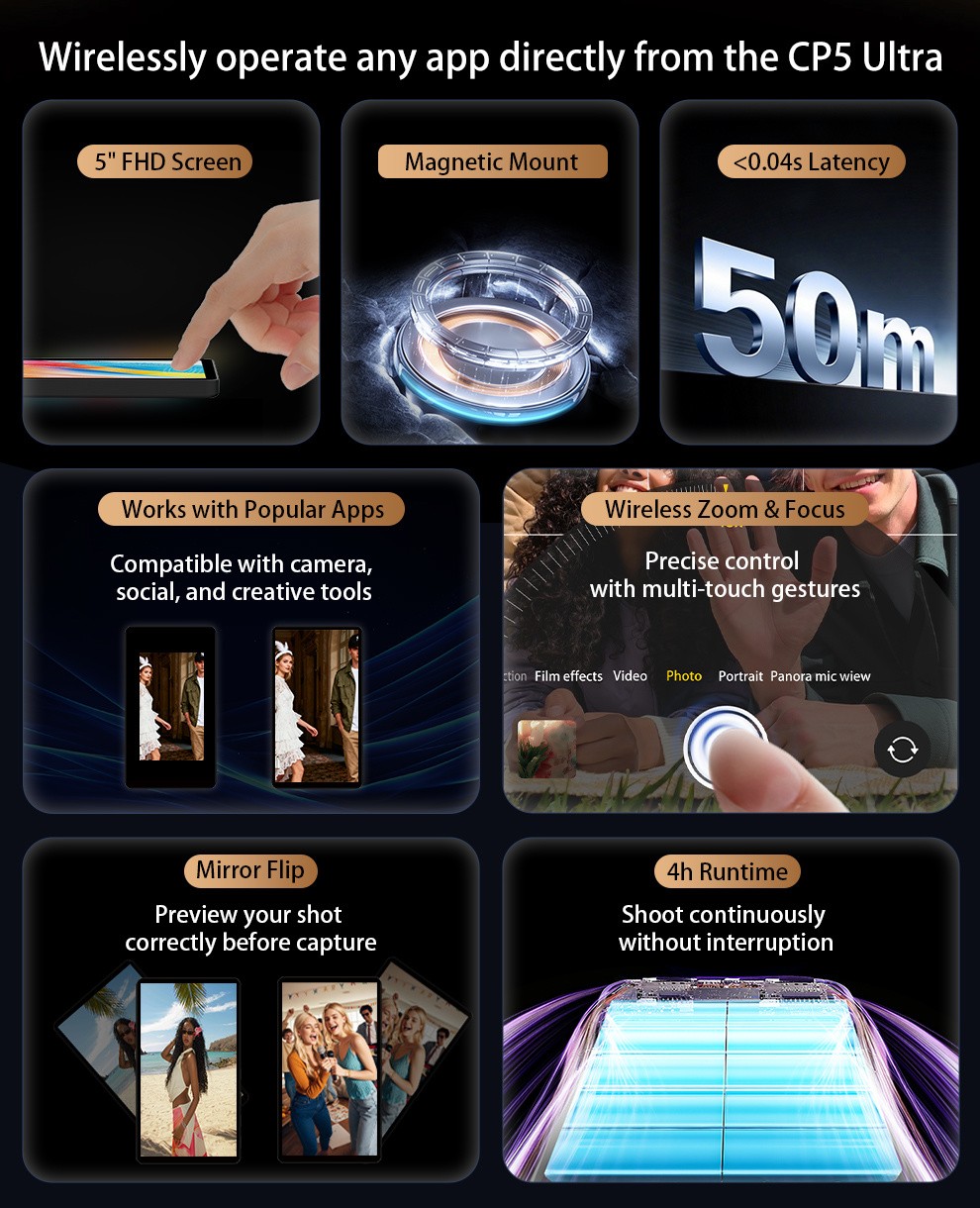 CP5 Ultra Black je určený pre tvorcov, ktorí chcú mať pri používaní zadného fotoaparátu svojho smartfónu úplnú kontrolu. Vďaka technológii reverzného ovládania vám umožňuje bezdrôtovo ovládať akúkoľvek aplikáciu – fotoaparát, sociálne médiá alebo kreatívne nástroje – priamo z monitora, čím eliminuje potrebu dotyku telefónu počas nahrávania alebo fotografovania.