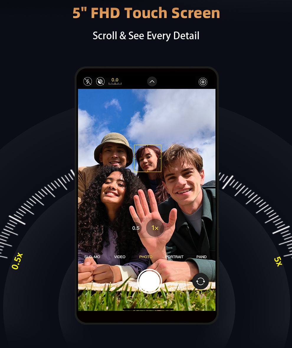 Jeho 5-palcový Full HD (1080 × 1920) multi-touch LCD displej poskytuje krištáľovo čistý náhľad a podporuje intuitívne gestá, ako je priblíženie prstami, zaostrenie ťuknutím a navigácia potiahnutím prstom pre presné ovládanie fotoaparátu. Vďaka zrkadleniu obrazovky a otočeniu zrkadla si môžete pred zachytením správne prezrieť zábery, čo je ideálne pre selfie, portréty, panoramatické zábery a produkciu videa.