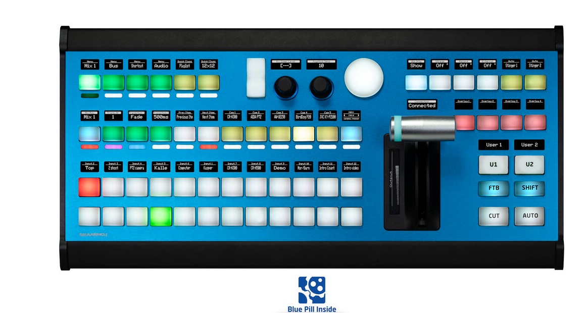 Stolný ovládač SKAARHOJ Air Fly Pro s integrovaným modulom Blue Pill je profesionálny ovládací panel pre vysielanie a riadenie PTZ kamier, vybavený T-barom s Hallovým efektom, joystickom, OLED displejmi a programovateľnými ovládacími prvkami, navrhnutý pre flexibilné pracovné postupy pri živom prepínaní a ovládaní kamier.
