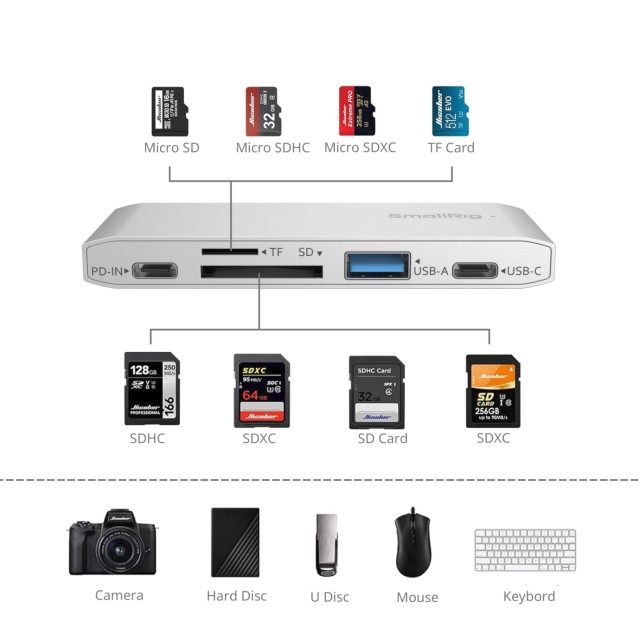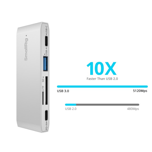 Vďaka dvom portom USB-C a USB-A s rýchlosťou 5 Gb/s uľahčuje rýchly prenos súborov s kapacitou 1 GB len za dve sekundy. Duálne sloty na karty SD/TF podporujú súčasné čítanie a zápis s maximálnou rýchlosťou čítania 100 MB/s a sú vhodné na karty SD, SDHC, SDXC, Micro SD, Micro SDXC a Micro SDHC. Okrem toho ponúka univerzálnu kompatibilitu so systémami Android, iOS, Windows a macOS.