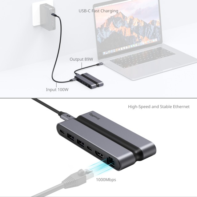 Súčasťou je 50 cm / 19,7 palcový dvojhlavý vysokorýchlostný kábel USB-C, ktorý podporuje prenos dát rýchlosťou 10 Gb/s na zvýšenie efektivity práce. Nezávislá dokovacia stanica pojme káble rôznych dĺžok, čím podporuje poriadok na pracovisku. Okrem toho bionická štruktúra pripomínajúca rebrovanie poskytuje účinný odvod tepla na bezpečné používanie. Táto kompaktná a prenosná dokovacia stanica je ideálna pre efektívny digitálny životný štýl.