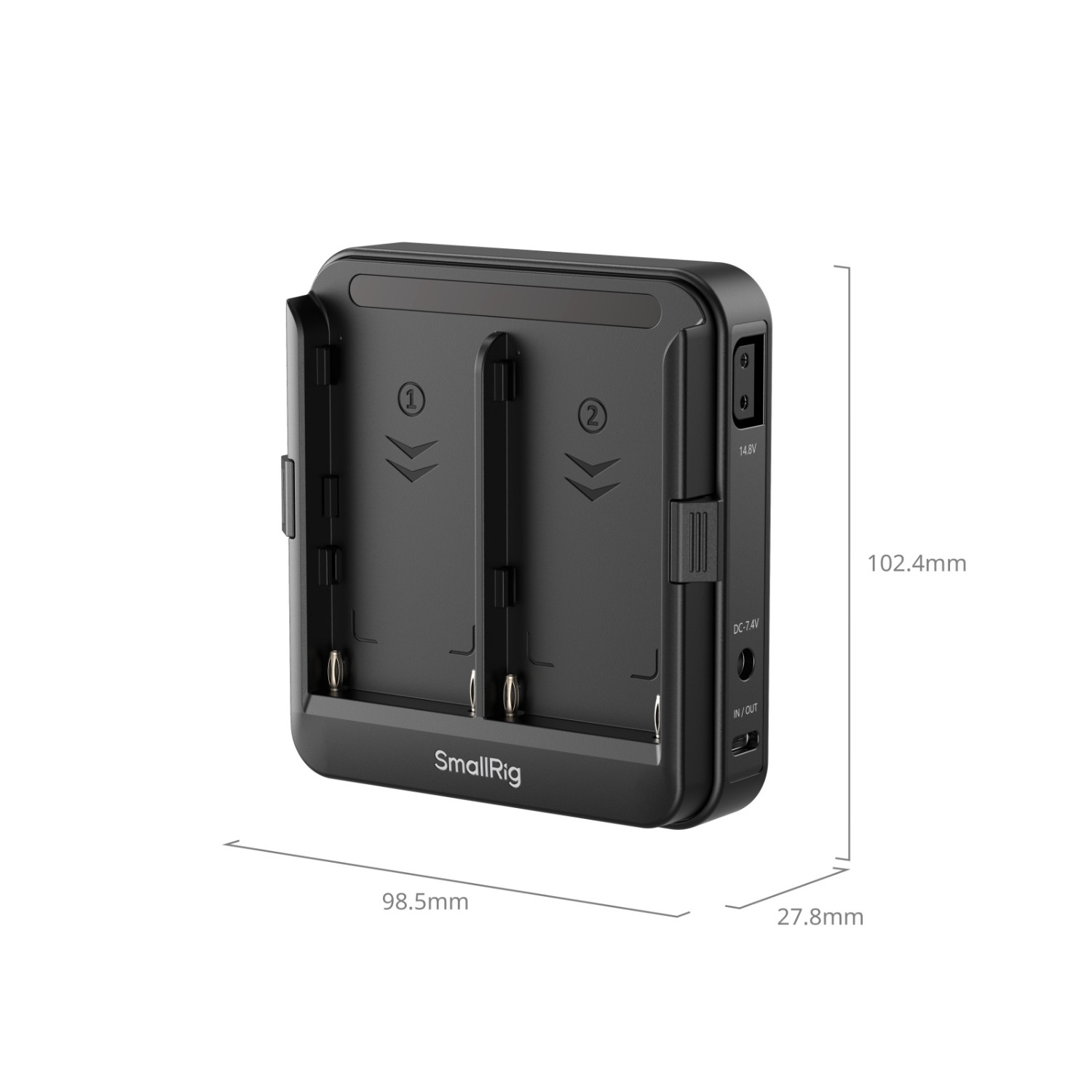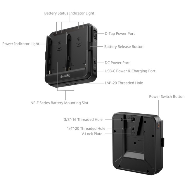 Adaptérna doska SmallRig pre batérie typu NP-F (podporuje UPS) 5536 je navrhnutá tak, aby poskytovala nepretržité napájanie bezzrkadlových fotoaparátov, monitorov a iných zariadení používajúcich batérie radu NP-F. Táto doska sa dá namontovať pomocou dosky V-mount alebo spodných otvorov so závitom 1/4"-20 a pojme jednu alebo dve batérie NP-F na napájanie vášho zariadenia. Ak sú nainštalované dve batérie, funkcia hot-swap vám umožňuje vymeniť jednu batériu bez vypnutia pripojených zariadení, čím je zabezpečený neprerušovaný napájací zdroj (UPS).