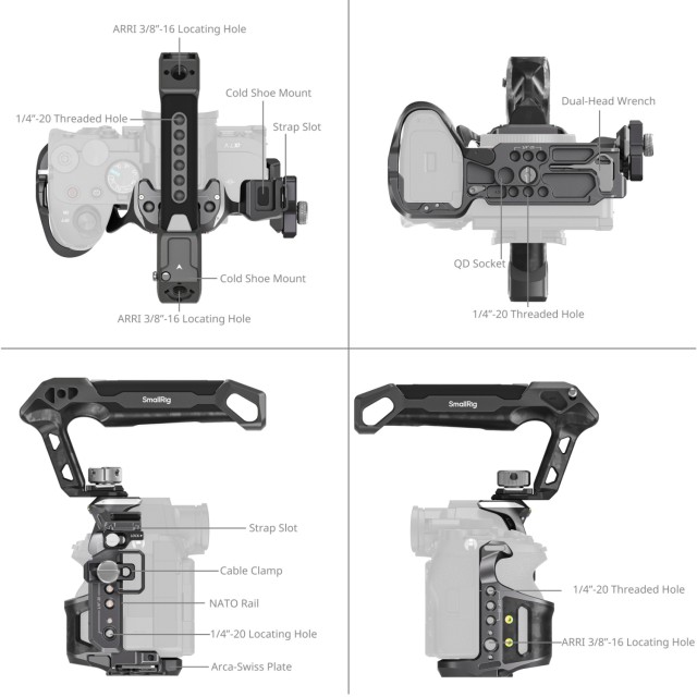 Klietka je vybavená trojbodovým uzamykacím systémom, ktorý zahŕňa spodný polohovací čap, skrutku 1/4"-20 a skrutku M2,5 na ľavej strane, čím je zaistené bezpečné upevnenie bez deformácie. Jej elegantný aerodynamický dizajn zabezpečuje voľný prístup ku všetkým ovládacím prvkom na hornom paneli fotoaparátu pre plynulú prevádzku. Horná rukoväť poskytuje pohodlný úchop, uľahčuje prenášanie, manévrovanie v nízkom uhle a plynulý pohyb fotoaparátu.