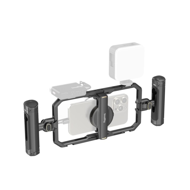 Súprava SmallRig All-in-One Video Kit For Smartphone Creators Quick Basic Edition 4597 poskytuje efektívne a kompaktné riešenie na profesionálne snímanie videí pomocou smartfónov. Súprava obsahuje univerzálnu klietku na smartfón, rýchloupínaciu rukoväť s bezdrôtovým ovládaním a bočnú rýchloupínaciu rukoväť. Vylepšená univerzálna klietka je vybavená viacerými otvormi so závitom 1/4"-20 a úchytmi na studenú päticu, čo umožňuje rozšíriť širokú škálu profesionálnych videozariadení. Okrem toho umožňuje pripevnenie 67 mm magnetických filtrov a je vybavená otvorom na ramenný popruh a otvorom na montáž dokovacej stanice. Klietka dokáže bezpečne uzamknúť telefón pomocou magnetického úchytu MagSafe alebo klipu na telefón. Rýchloupínacia bočná rukoväť podporuje rýchle upevnenie a môže fungovať ako bočná aj horná rukoväť prostredníctvom rôznych spôsobov montáže. Odnímateľný bezdrôtový ovládač umožňuje diaľkové spúšťanie uzávierky a nahrávanie, pričom maximálna vzdialenosť diaľkového ovládania je až 10 m / 32,8 stôp.