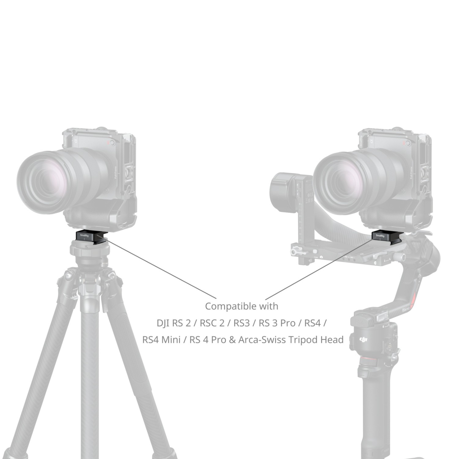Doska je kompatibilná so statívmi typu Arca a stabilizátormi radu DJI RS (vrátane RS 2, RSC 2, RS 3, RS 3 Pro, RS 4, RS 4 Pro a RS 4 Mini), čo uľahčuje efektívne prechody medzi nastaveniami statívu a gimbalu a zlepšuje pracovný postup. Súčasťou balenia je dvojitý kľúč na jednoduchú inštaláciu a demontáž.
