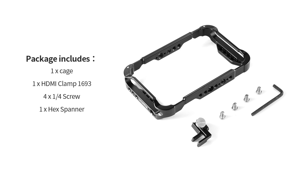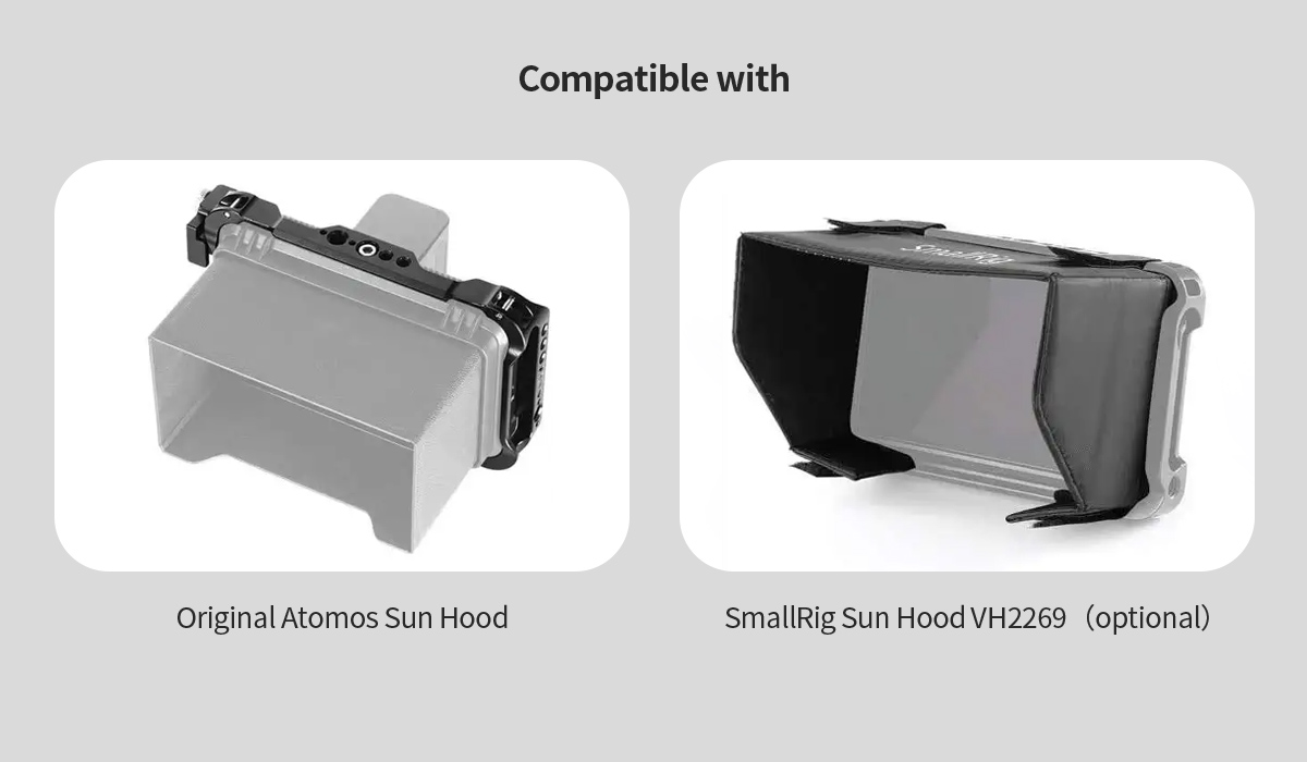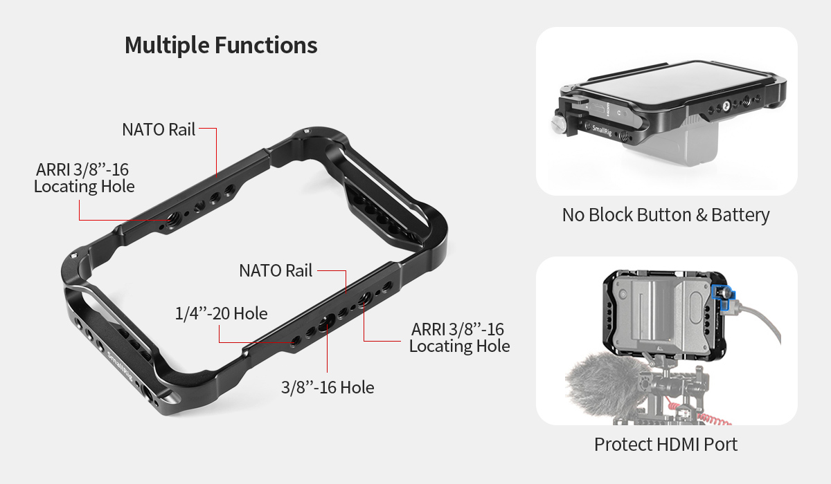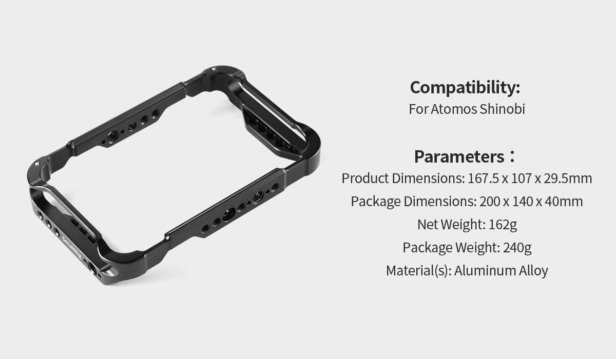 Klietka SmallRig AtomX 5" pre Shinobi CMA2305 bola navrhnutá tak, aby poskytovala dodatočnú ochrannú exoskeletovú konštrukciu pre monitor s širokou škálou štandardných upevňovacích bodov. Klietka sa pripevňuje k monitoru pomocou dvoch skrutiek 1/4"-20 na hornej a spodnej strane. Po celom obvode klietky sa nachádza viacero otvorov 1/4"-20, 3/8"-16 na všetkých stranách, ako aj na zadnej strane monitora, čo poskytuje maximálnu flexibilitu pri montáži. Upevňovacie body ARRI sa nachádzajú na všetkých stranách a NATO lišty sú k dispozícii aj na hornej a spodnej strane, aby bolo možné použiť rad držiakov SmallRig. Klietka obsahuje jednu svorku na HDMI kábel, ktorá je kompatibilná s radom káblov Atomos a ďalšími, aby chránila HDMI kábel a port. Je vybavená vyvýšenými upevňovacími bodmi na hornej a spodnej strane klietky pre použitie s krčnými popruhmi a pre uchytenie rámu Atomos Ninja V Sunhood.
