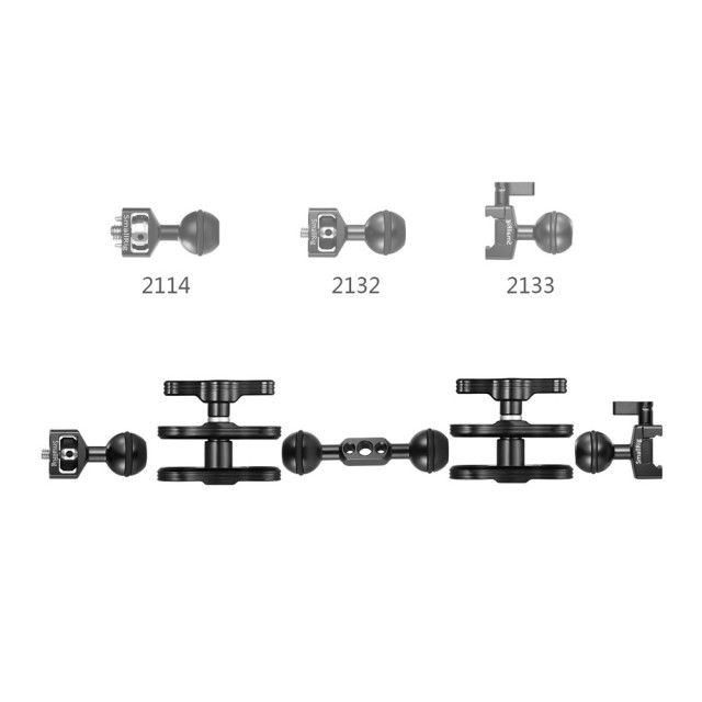 SmallRig Ballhead with NATO Clamp 2133 v kombinácii so svorkou Smallrig Ballhead Clamp 2134 môže spolupracovať s ďalším príslušenstvom ball head, ako sú 2114, 2132 a 2108, čím sa dosiahnu ďalšie vlastné konfigurácie. Je ideálny na montáž príslušenstva s koľajnicami NATO na rýchle uvoľnenie, ako je horná doska 1853, bočná doska 1854 a klietky na fotoaparát a monitor, ako sú 1834/1726/1788.