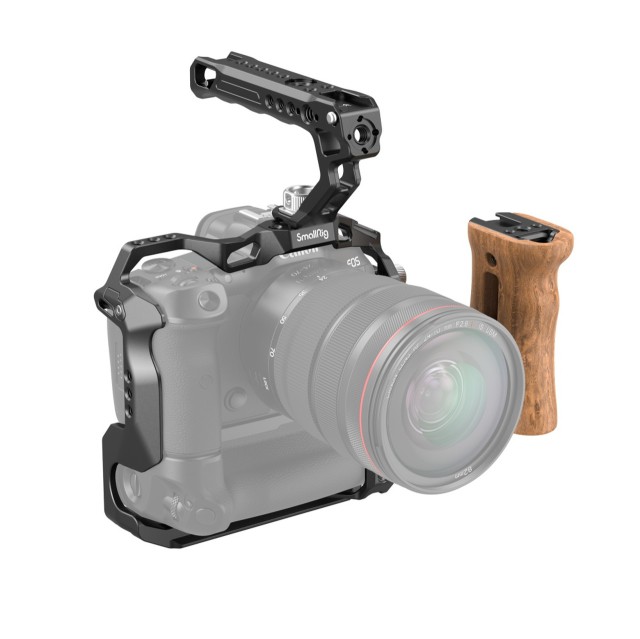 Základná súprava SmallRig pre EOS R5 a R6 s batériovým gripom BG-R10 3707 chráni fotoaparát a zároveň uľahčuje natáčanie videa vďaka viacerým montážnym bodom. Horná rukoväť 2165C a bočná rukoväť 2093C umožňujú samostatné snímanie z ruky. Súprava ako celok je vybavená viacerými montážnymi bodmi (polohovacie otvory ARRI 3/8"-16, závitové otvory 1/4"-20, závitový otvor 3/8"-16, cold shoes), ktoré podporujú širokú škálu príslušenstva. Klietka je upevnená jednou skrutkou v spodnej časti a otvormi na ramenné popruhy na oboch stranách. Súčasťou súpravy je aj svorka na káble 2981, ktorá chráni káble HDMI a USB-C pred odpojením signálu v dôsledku uvoľnených káblov.