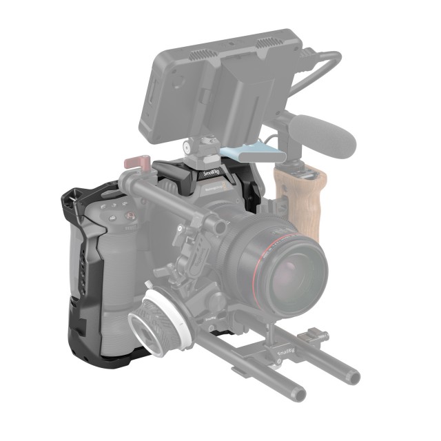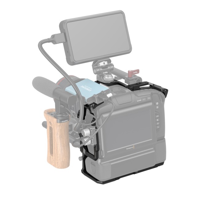 Kompatibilná klietka SmallRig Battery Grip pre BMPCC 6K Pro 3382 je špeciálne navrhnutá pre BMPCC 6K Pro a batériový grip. Pevne upevňuje fotoaparát pomocou otvorov so závitom na hornej a spodnej strane, aby sa zabránilo jeho skrúteniu, a na spodnej strane má gumové podložky, ktoré zabraňujú poškriabaniu. Je vybavená polohovacím otvorom ARRI 3/8"-16 pre hornú rukoväť ARRI 2165 a studenou pätkou pre držiak Samsung T5 SSD 3272. Klietka je vybavená otvormi na ramenný popruh na hornej strane každej strany na pripevnenie ramenného popruhu alebo iného príslušenstva. Ľavá strana má lištu NATO, otvory so závitom 1/4"-20 na montáž bočnej rukoväte 2270 a špeciálnu svorku na káble HDMI a USB-C 3271. Otvory v pravom hornom rohu a v ľavom dolnom rohu umožňujú prístup k svorke 3276 pre následné zaostrovanie. Jeho spodná časť je kompatibilná s dvojtaktnou objímkou 1943, ktorá poskytuje vzdialenosť medzi oboma tyčami a stredom objektívu 85 mm a umožňuje inštaláciu držiaka objektívu. Okrem toho je v spodnej časti klietky zabudovaný skrutkovač pre vašu montáž. Tvarovo prispôsobená klietka neblokuje porty, sloty na karty, chladiče ani dvierka batérie. Jeho pravá strana je ergonomicky navrhnutá na pohodlné držanie.