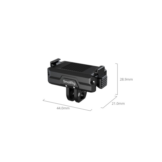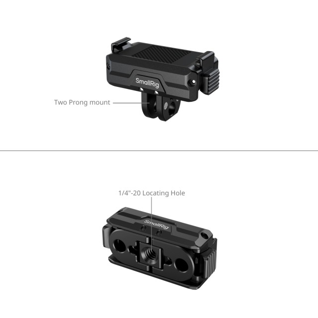 Je vyrobený z odolnej zliatiny hliníka, čo zaručuje spoľahlivý výkon. Základňa je vybavená otvorom so závitom 1/4"-20 pre bezproblémové pripevnenie k statívom, selfie tyčiam (ID 5403), prísavným držiakom (ID 3566), svorkám na riadidlá (ID 4191) a ďalšiemu príslušenstvu. Základňa obsahuje aj skladací 2-kolíkový držiak pre širokú kompatibilitu s príslušenstvom pre akčné kamery.