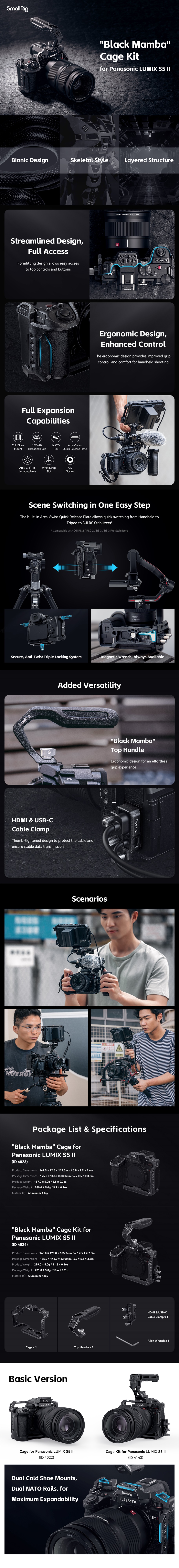 Súprava SmallRig "Black Mamba" Cage Kit pre Panasonic LUMIX S5 II / S5 IIX 4024 je určená na pomoc pri fotografovaní z ruky a na pripevnenie príslušenstva. Obsahuje klietku, svorku na káble HDMI a USB-C a hornú rukoväť, ktorá, ergonomická horná rukoväť je pohodlná a uľahčuje pohyb fotoaparátu a zábery pod nízkym uhlom; zjednodušená klietka s priehľadnými okrajmi poskytuje úplný prístup k horným ovládacím prvkom; a káblovou svorkou s uťahovaním pomocou palca možno zároveň upevniť káble HDMI a USB-C.