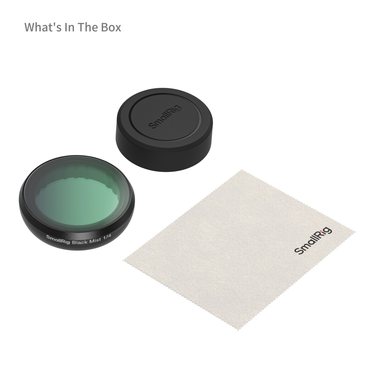 Balíček obsahuje čierny filter 1/4, silikónový kryt objektívu a čistiacu utierku. Čierny filter 1/4 zmäkčuje jasné miesta a vytvára snový, filmový efekt. Rýchly snap-on dizajn umožňuje priame pripevnenie bez nutnosti odstrániť objektív, čo výrazne zlepšuje efektivitu snímania.